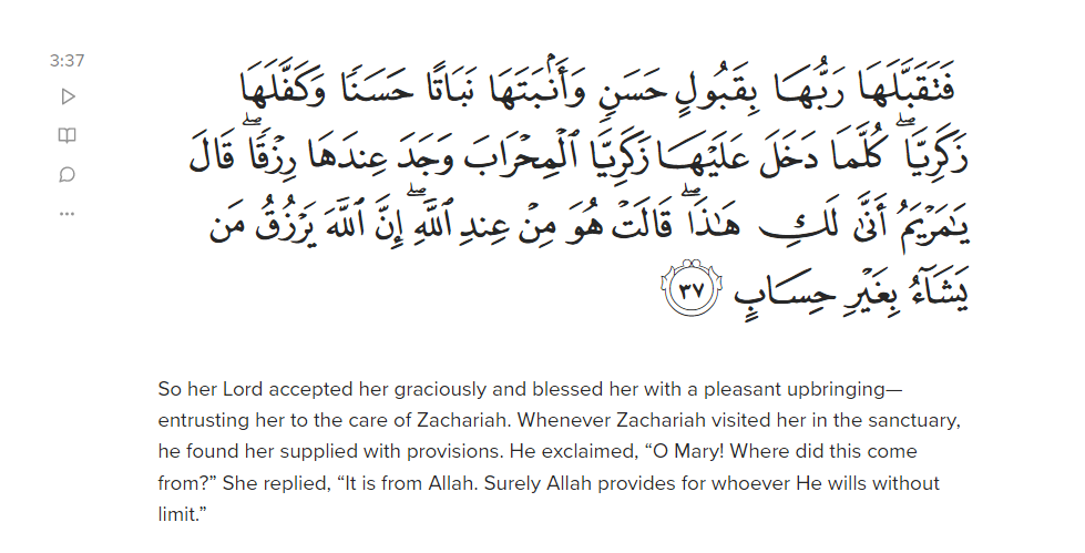 A another brief pause, Muslim readers will no doubt have a special reaction to this story – one of the curious aspects of Maryam, alayhas salaam, related to us in the holy Quran is that she receives a special food from Allah that surprises Zakariya, alayhis salaam.