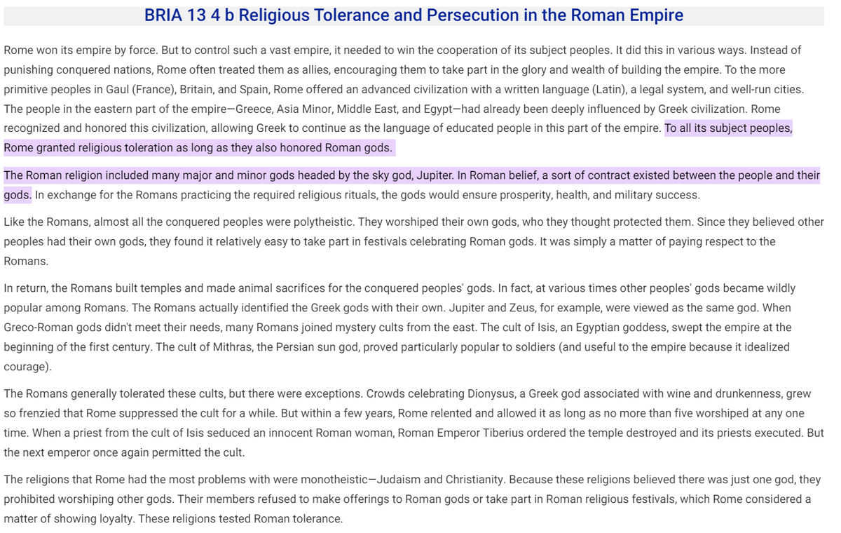 Though I take a lot of the above with a grain of salt, particularly regarding the ‘benefits’ of being under the Roman empire, this demonstrates what I've found to be the general narrative regarding religious flexibility under the Romans and reiterates the difficulties posed by monotheistic faiths. The conviction of the Jews in the true religion of Allah, their rejection of polytheism and idolatry, in my opinion pushed the limitations of polytheism to a breaking point.