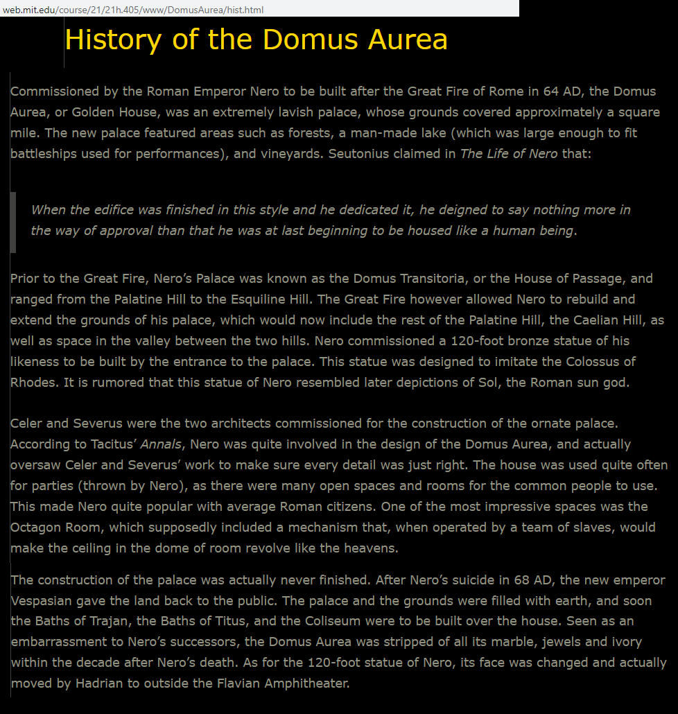 Nero raged against the government and then miraculously the fire began and thus was the ground cleared for the ‘Domus Aurea’ -