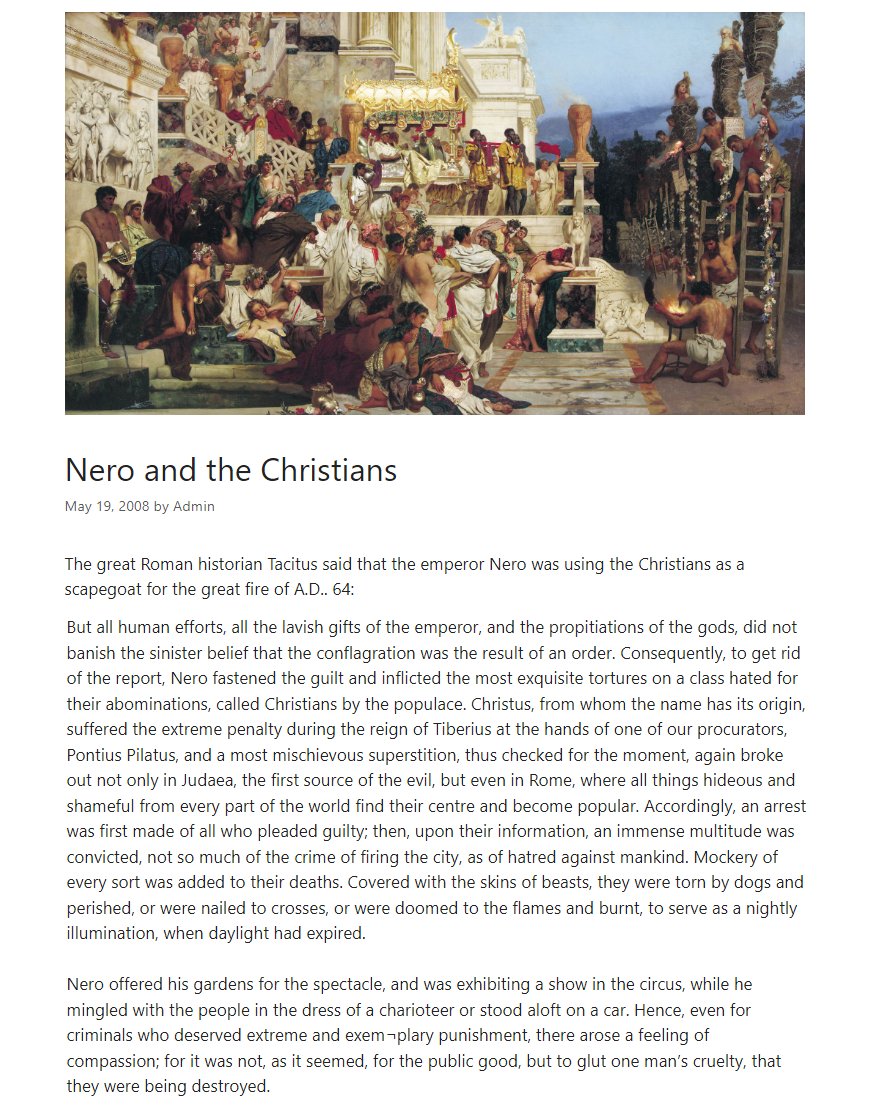 Not only this, but he pushes a framing of that – the Christians were used as scapegoats for the fire, that due to persistent rumors Nero needed to *find someone to blame*.