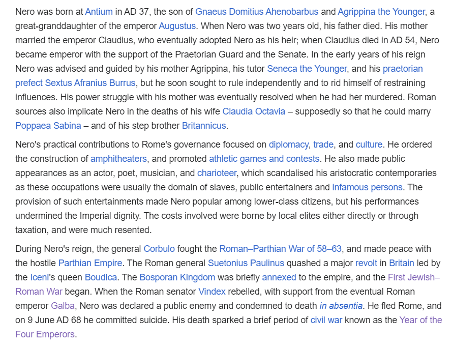 What am I getting at – if Nero's personality and character was a form of political theater designed to obscure a deeper and longer-term design, and modern political drama and rivalries are similarly theatrical, why not extend this to the suicides, assassinations, and intrigue as well? Could these be distractions, staged spectacles, to obscure the true form and vulnerabilities and character of the rule? Why not see this as simply another feature of the Roman mode of politics?