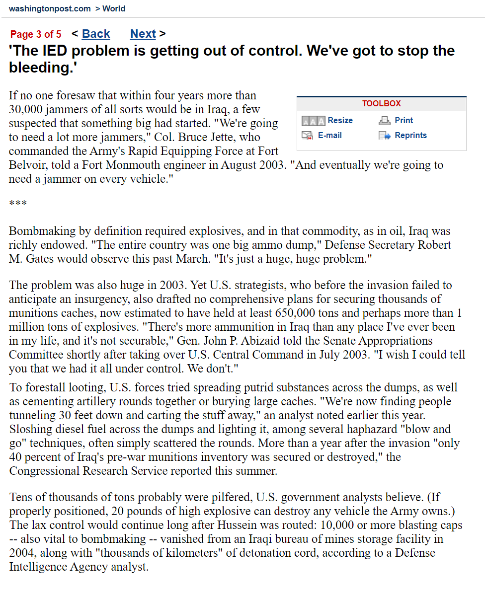 Back to the idea at hand, this ‘fragmenting’ for lack of a better word can be observed at multiple levels with regards to the war against Iraq – it characterizes the primary narrative for the occupation itself, it characterizes the specific phenomenon of IEDs, and it characterizes the more-specific episode of the looted ammunition.
