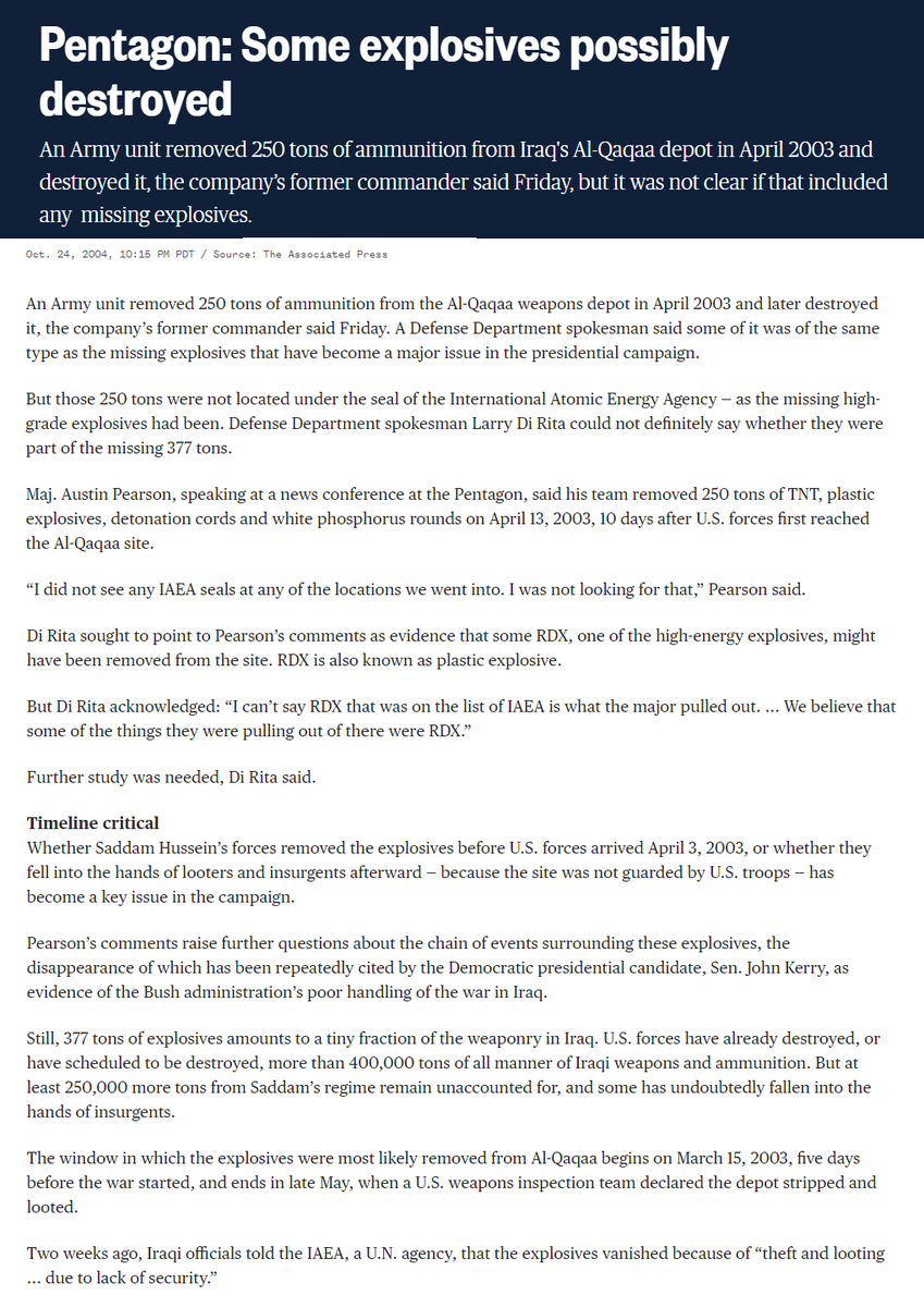 The army did remove 250 tons of material from Al Qaqaa in April and destroyed it, and some of it was of the same type as [one of] the materials listed as missing. But – the 250 tons were not under the seal of the IAEA, which the explosives considered “missing” had been.