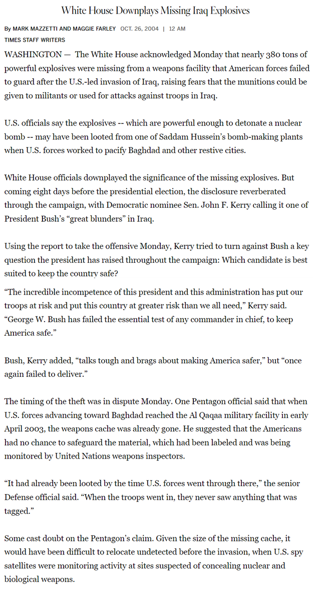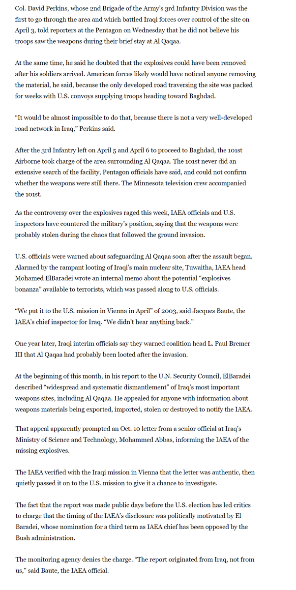 For the sake of completeness I’ll briefly mention the controversy in the final paragraphs – whether or not the timing of the revelation of missing weapons was picked in order to ‘oppose’ the Bush administration. The Bush camp accuses the IAEA, the IAEA punts and says the report came from the Iraqi government – the reality is that it was designed to appear in the last weeks of the election but that the reason for this was maximum exposure of this idea that would underpin the mythology of the occupation. The partisan controversy serves as ‘plausible deniability’ in a sense.