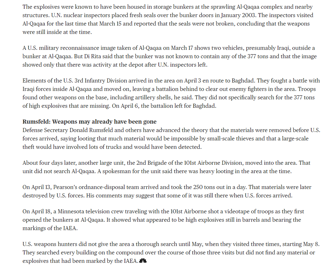 Four days later, around April 10th, the 101st Airborne – who are certainly one of the ‘main characters’ of the united states coalition, as we will see as the invasion progresses – shows up and ‘did not search Al Qaqaa’. Then the 250 tons were removed and destroyed.