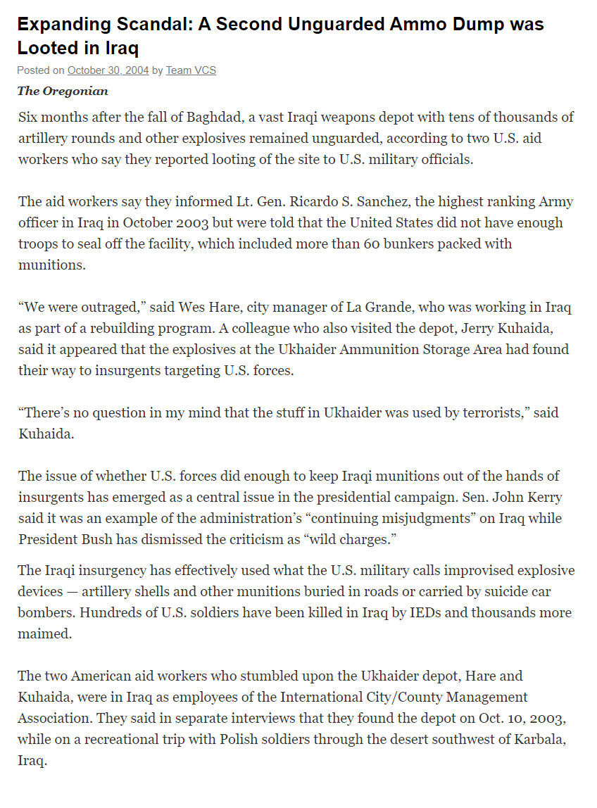 Now – this is a 2007 article, rerunning a story that “broke” in 2004. Why? The looting of the ammunition stores is the narrative reason given for the specter of IEDs, and the specter of IEDs had to be constantly rewashed into the brains of invader sympathizers.