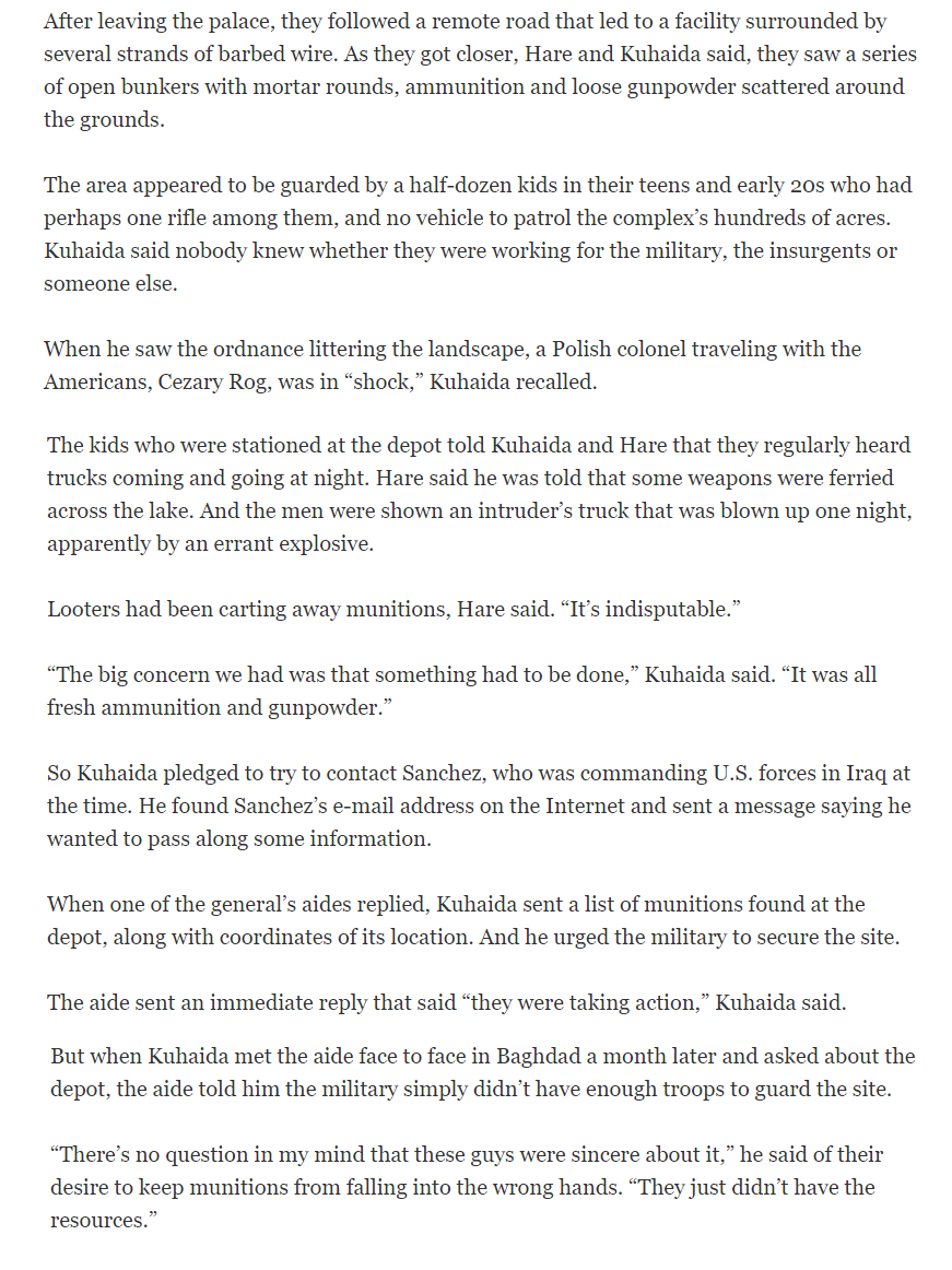 Here the colonel who controlled the area before the 101st reiterates the ‘unlikely to have been taken after’ narrative and adds the dimension of limited roads in and out. And that the only road was – pay attention - packed for weeks with US convoys supplying troops heading toward Baghdad.