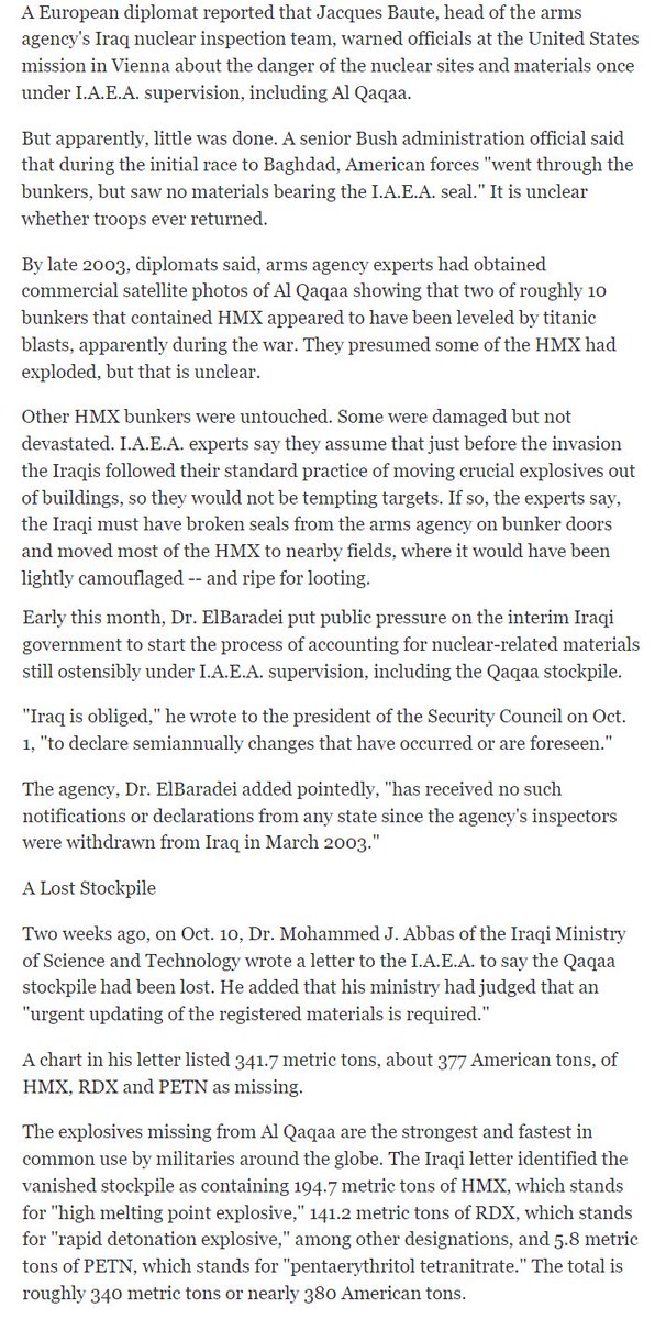 Now, note in the fourth paragraph – if the explosives were moved before the invasion, the IAEA seals on bunker doors would be broken. So one strand is, ‘early removal, pre-invasion, broken seals, stashed more or less openly in nearby fields and thus easily stolen’.